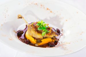 Confit of Skeaghanore Duck Leg, served with Sweet Potato Mash and Baby Onion Jus.