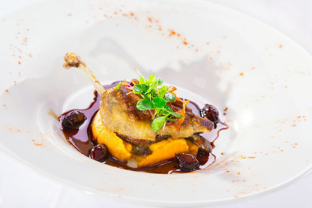 Confit of Skeaghanore Duck Leg, served with Sweet Potato Mash and Baby Onion Jus.