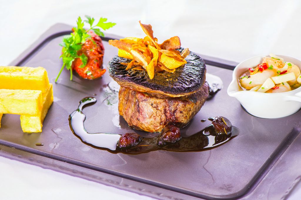 Cellar One Surf n’ Turf – 8oz Fillet of Beef with Prawn Pil Pil, Flat Cap Mushroom, Tomato & Chorizo Ragout, Chunky Chips and Baby onion Jus